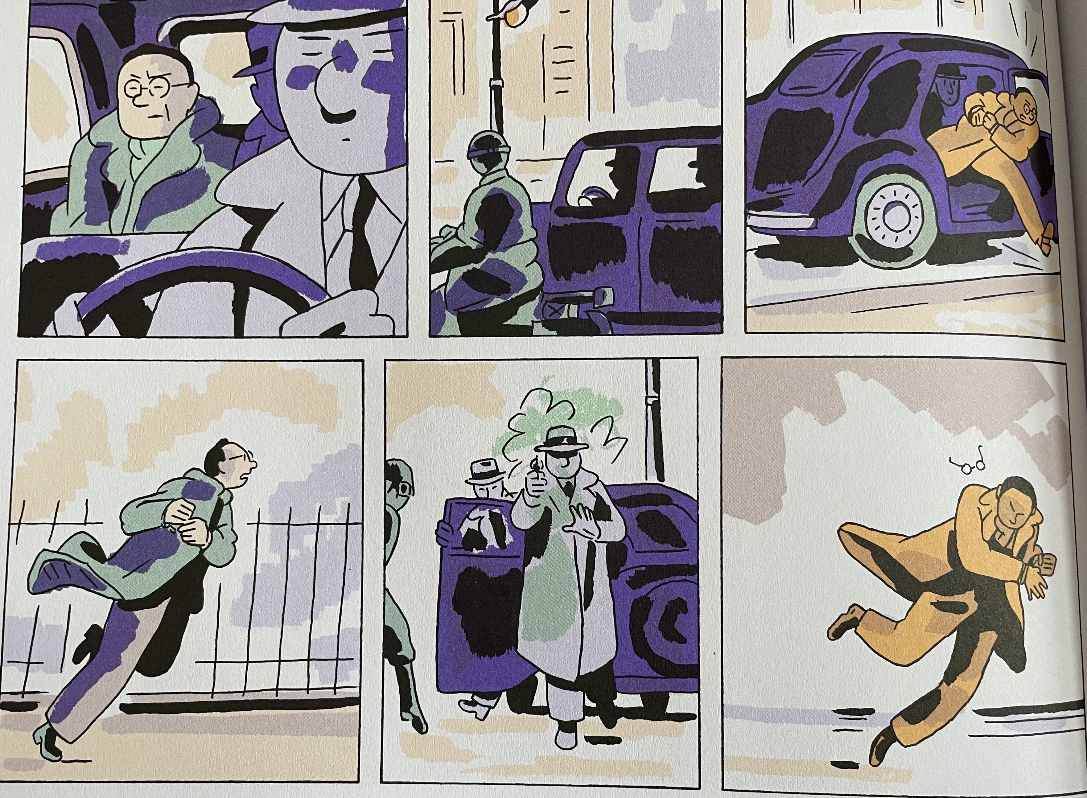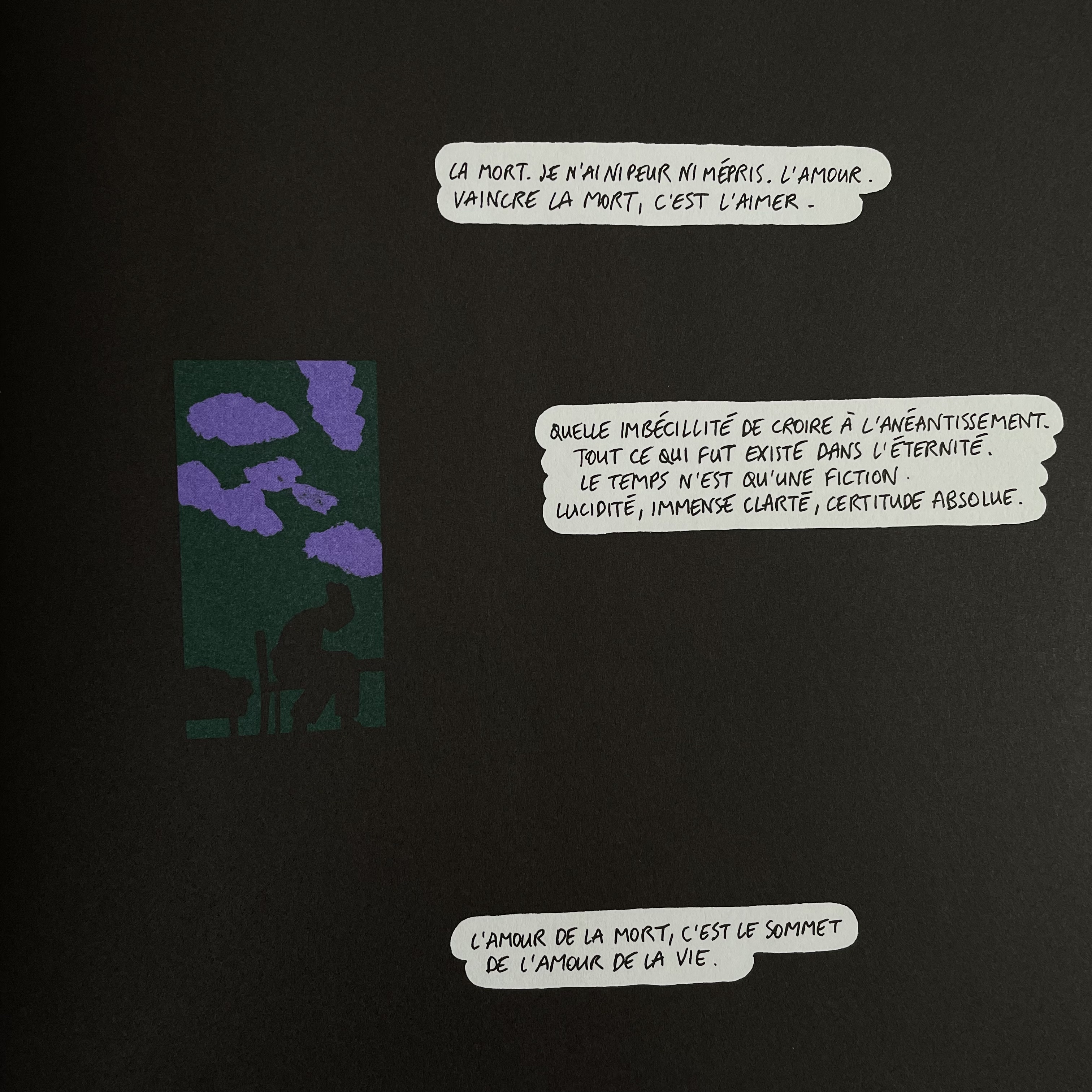 Troisième coup de génie, le dessin évidemment. Refusant la facilité d’un traité réaliste, d’une ligne trop claire, s’obstinant à ne pas rentrer dans les détails, l’illustrateur Simon Roussin étale ses aplats (surprenante mais convaincante palette de violet, de vert, d’orange) et compose de son trait virtuose des personnages flottants et un environnement qui évoque plus qu’il ne représente ; une ambiance qui suggère plus qu’elle ne (dé)montre. Un choix qui saisit le lecteur, l’enveloppe pour mieux le happer. Un choix qui confère à cette histoire une dimension quasi-mystique, comme si des voix du passé surgissaient pour nous raconter leur légende.